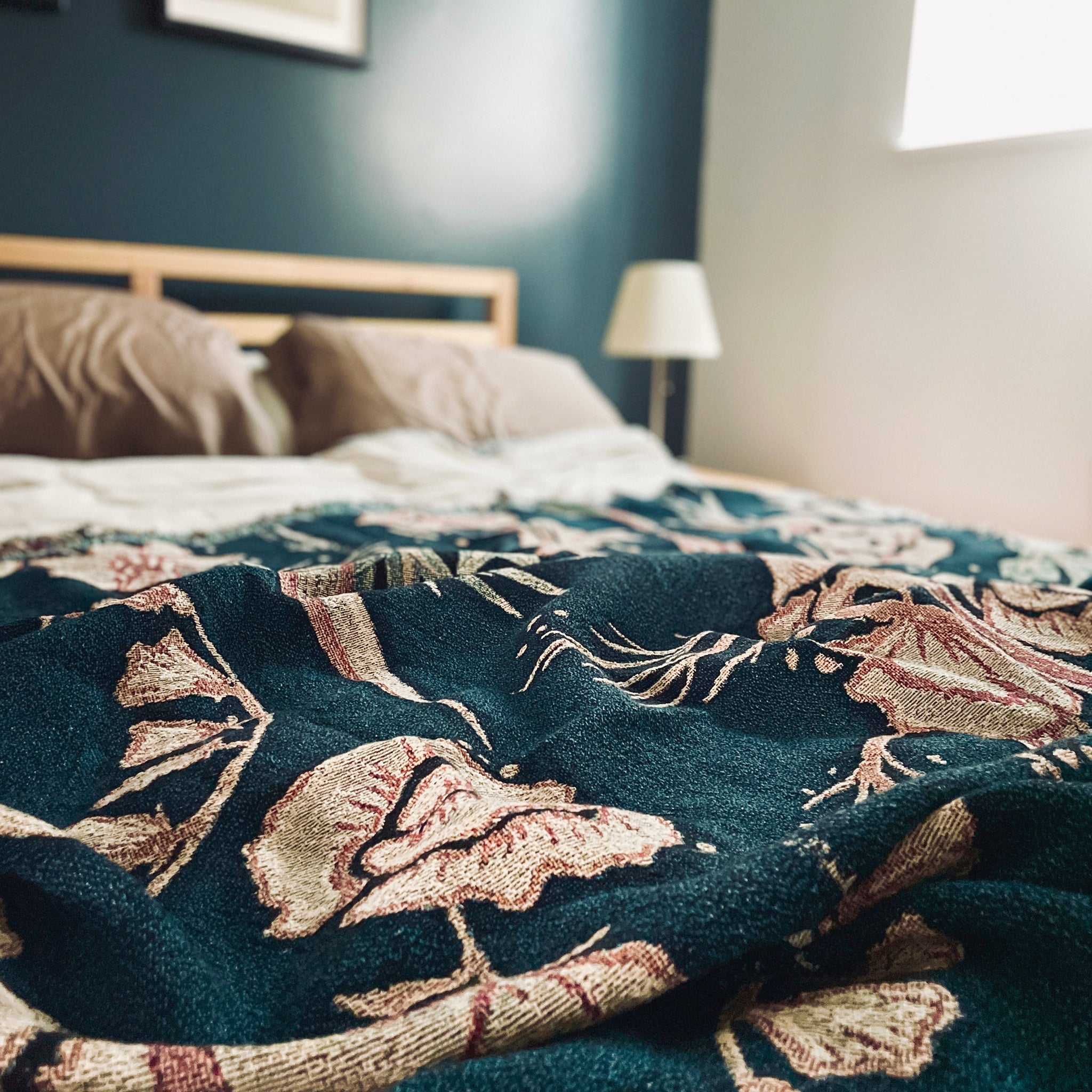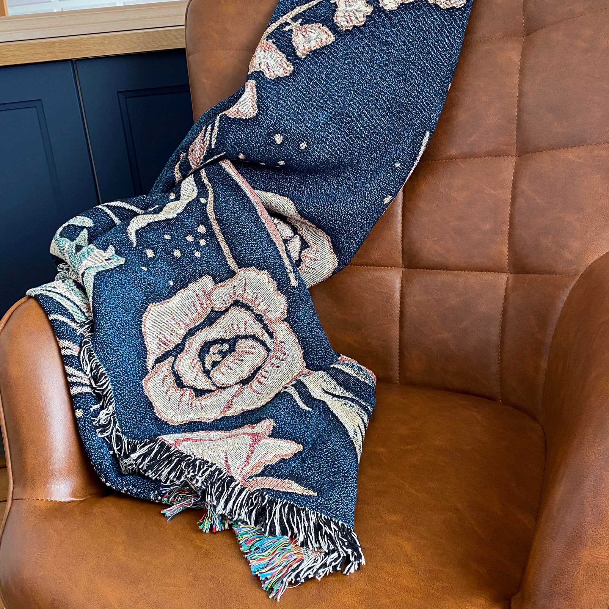 Our beautiful vintage-inspired floral pattern was hand drawn and is woven into the Big Throw from 95% cotton yarn - most of which is recycled. Each blanket is individually made to order by a family run mill in the USA. We only order exactly what we have sold, so waste is minimal. Any waste that IS created is remade into other textiles, and shredded scraps from their bins are sorted by colour and either woven back into yarn or used as stuffing or other non-woven textiles.