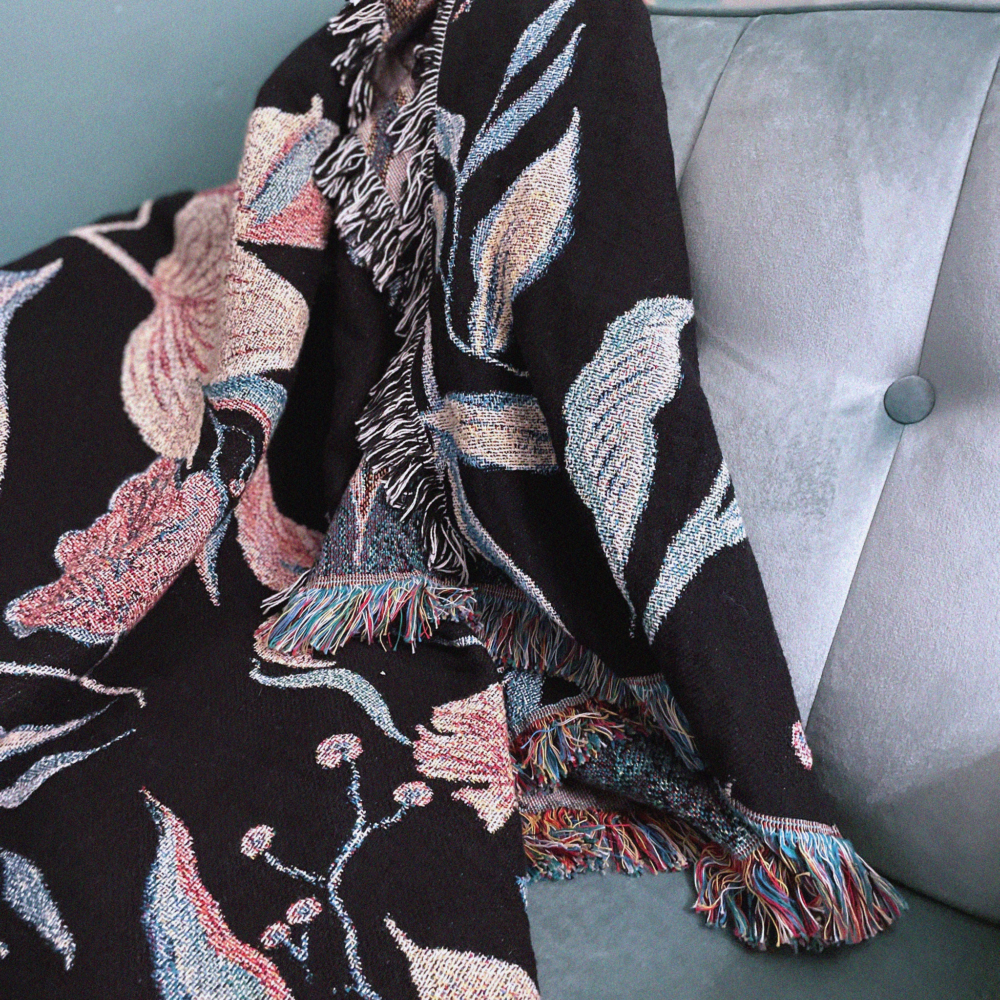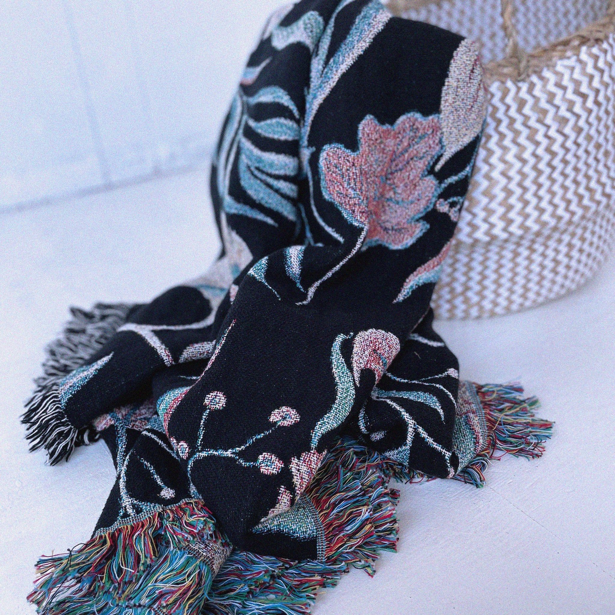 Our beautiful vintage-inspired floral pattern was hand painted and is woven into the Big Throw from 95% cotton yarn - most of which is recycled. Each blanket is individually made to order by a family run mill in the USA. We only order exactly what we have sold, so waste is minimal. Any waste that IS created is remade into other textiles, and shredded scraps from their bins are sorted by colour and either woven back into yarn or used as stuffing or other non-woven textiles.